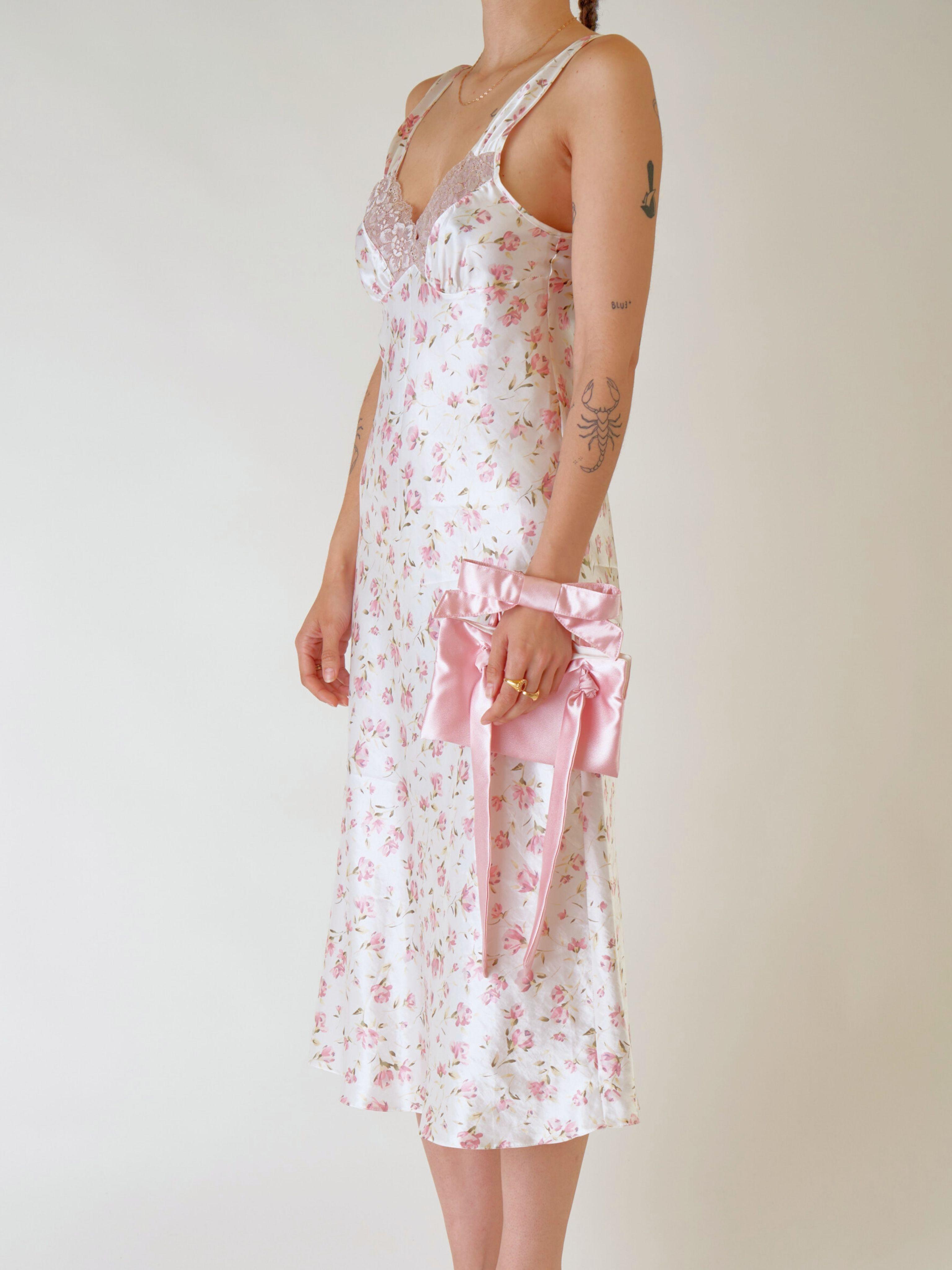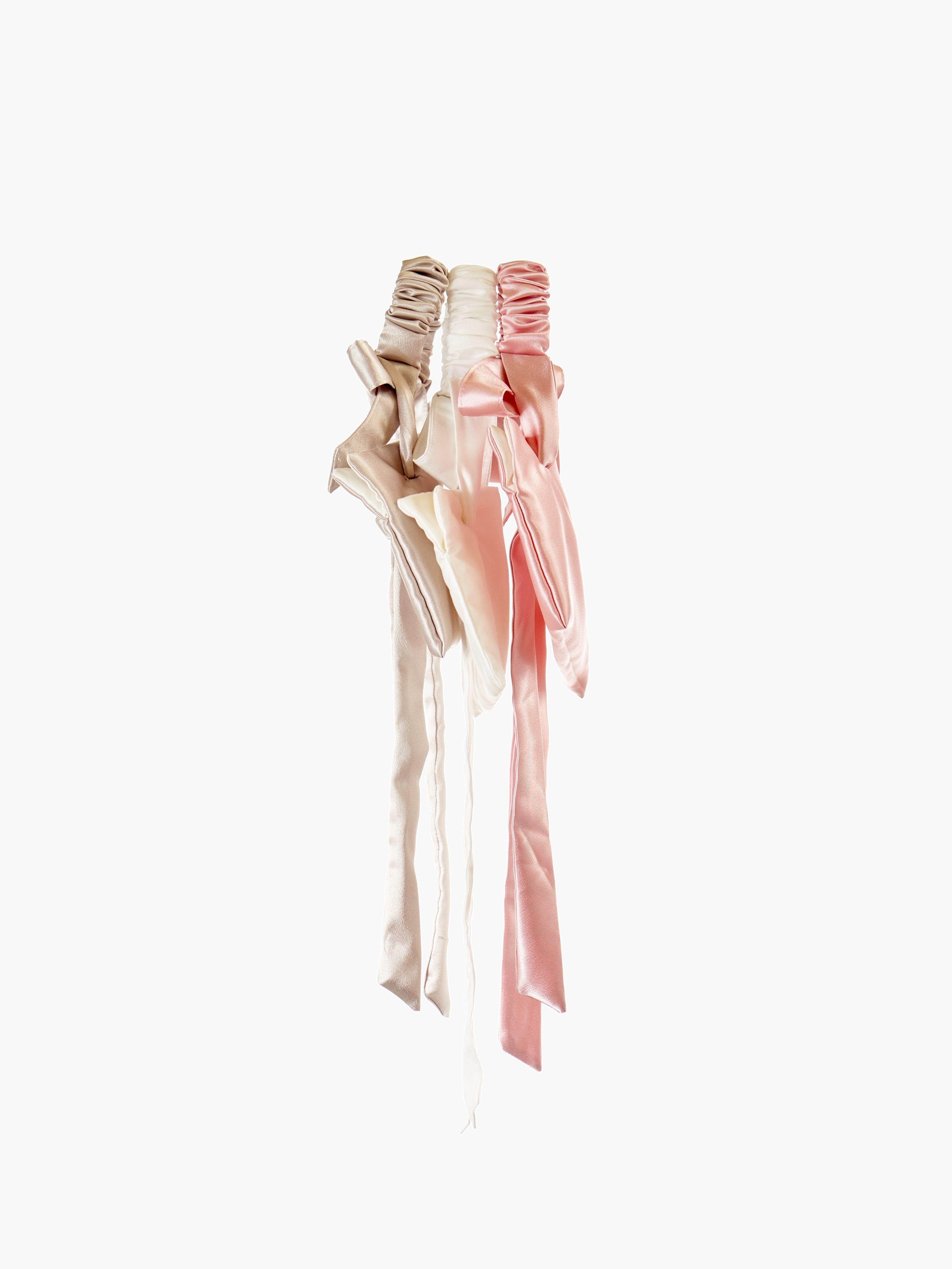 Rectangular bracelet bag with bow scrunchie handle, silver ROOP logo tag, fully lined.