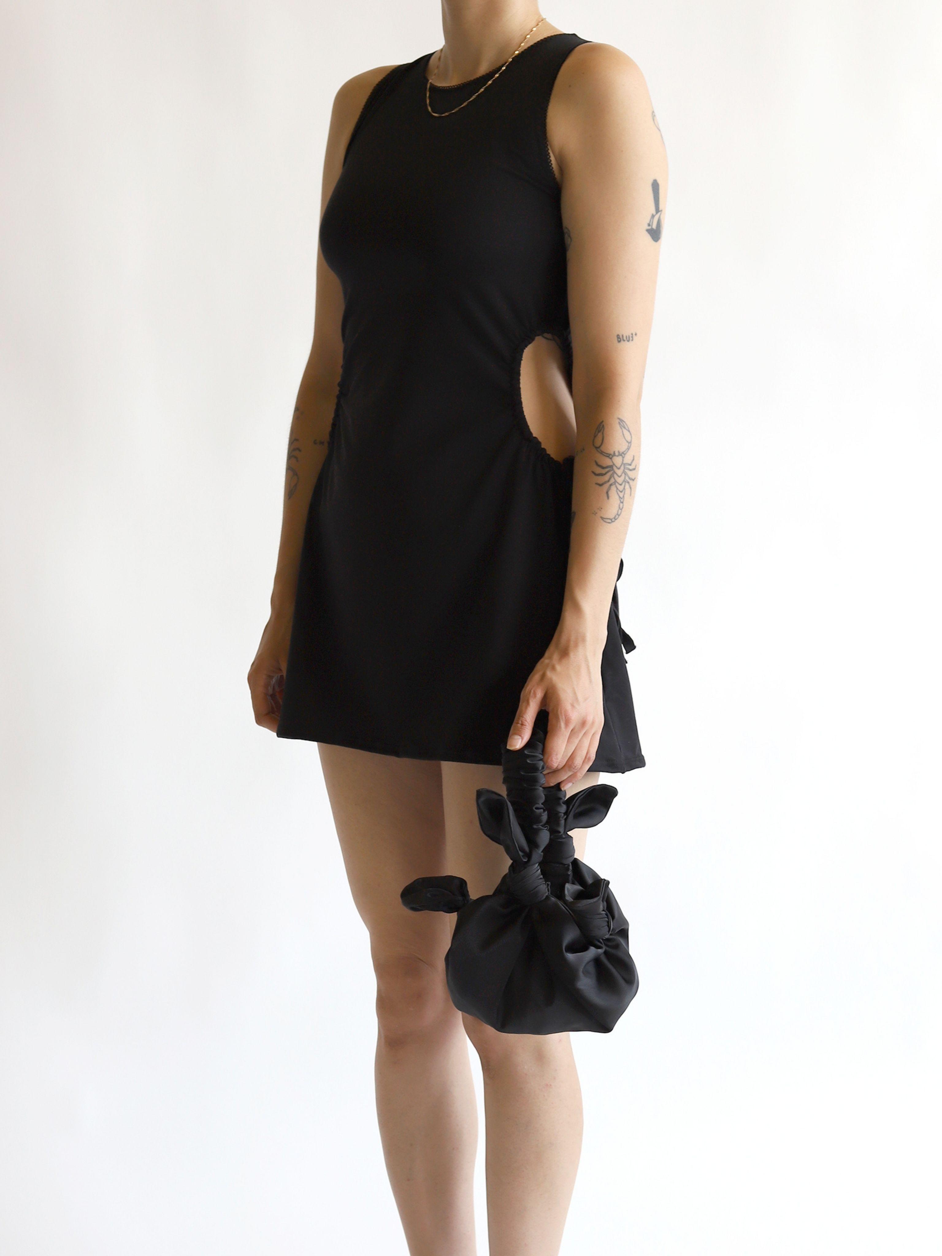 Inspired by furoshiki wrapping, finished with four elegant knots and our signature scrunchie strap that gives her a playful bounce with every step.