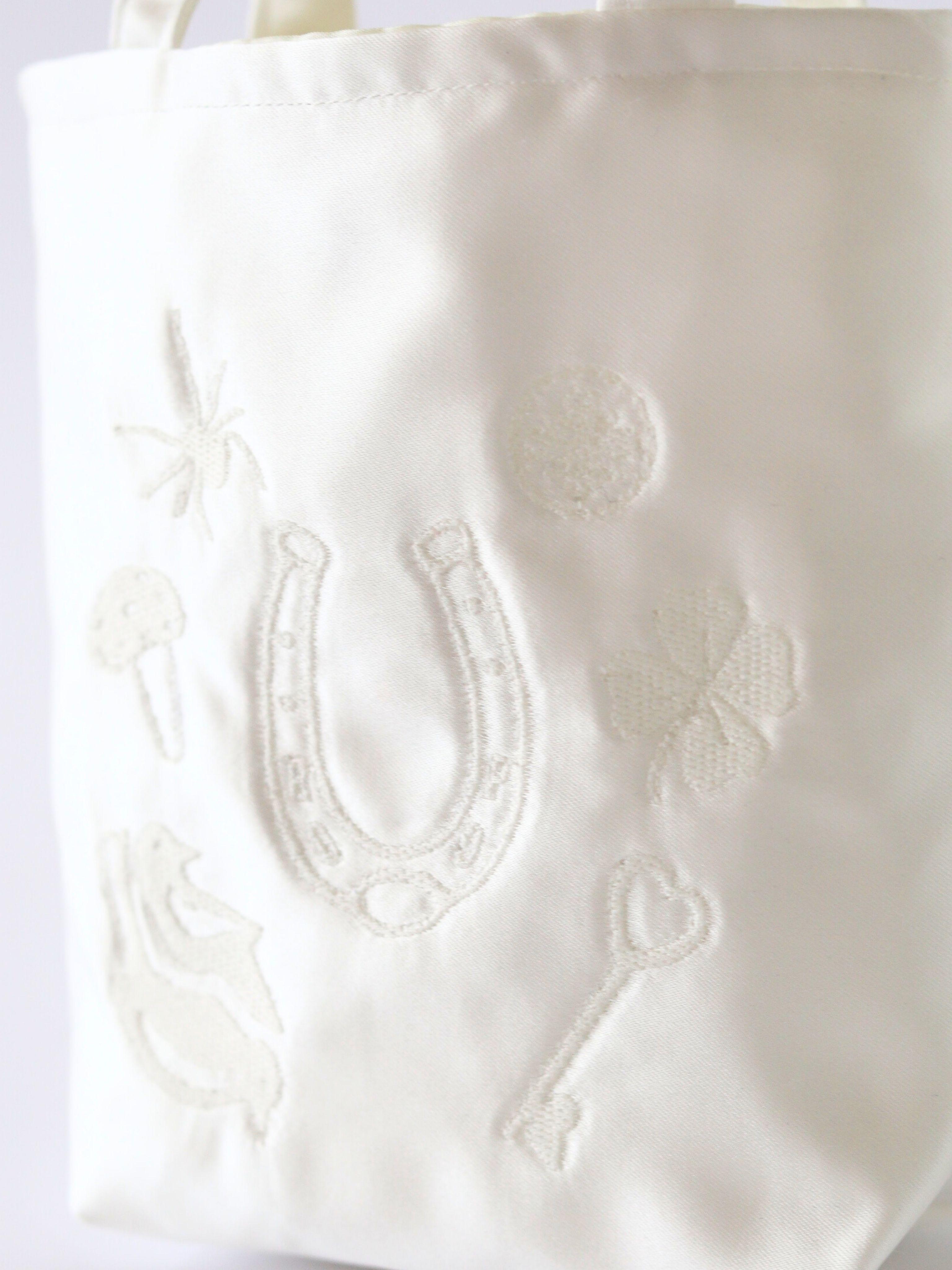 Carry good luck everywhere you go with little Felicity. A mini satin tote adorned with embroidered lucky charms. Beautifully handmade for the big day & beyond. You can personalise with your own embroidery too.