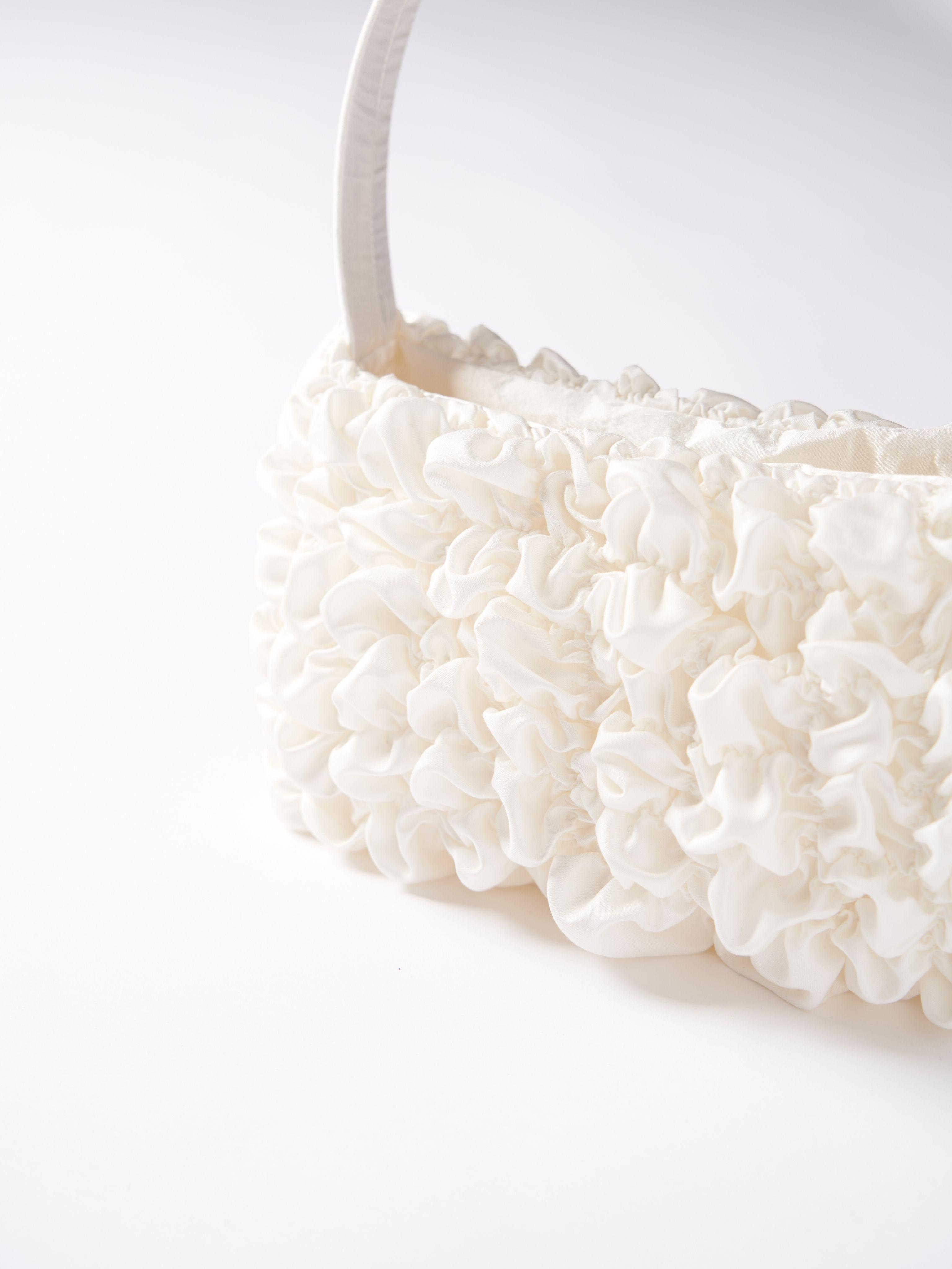 The sculptural textured exterior wraps around a rectangular baguette shape, with a structured handle, fully lined with a matching zipper.