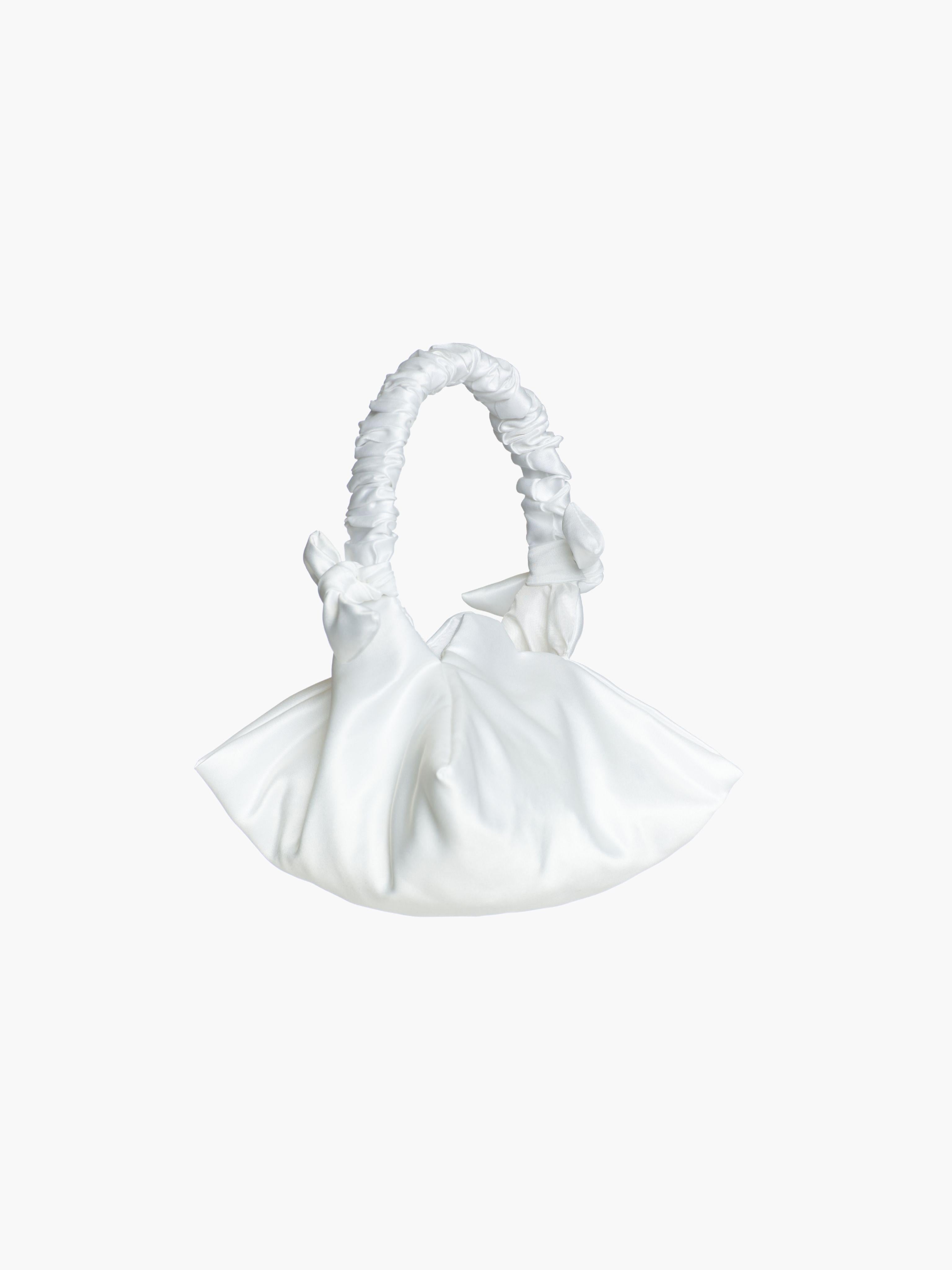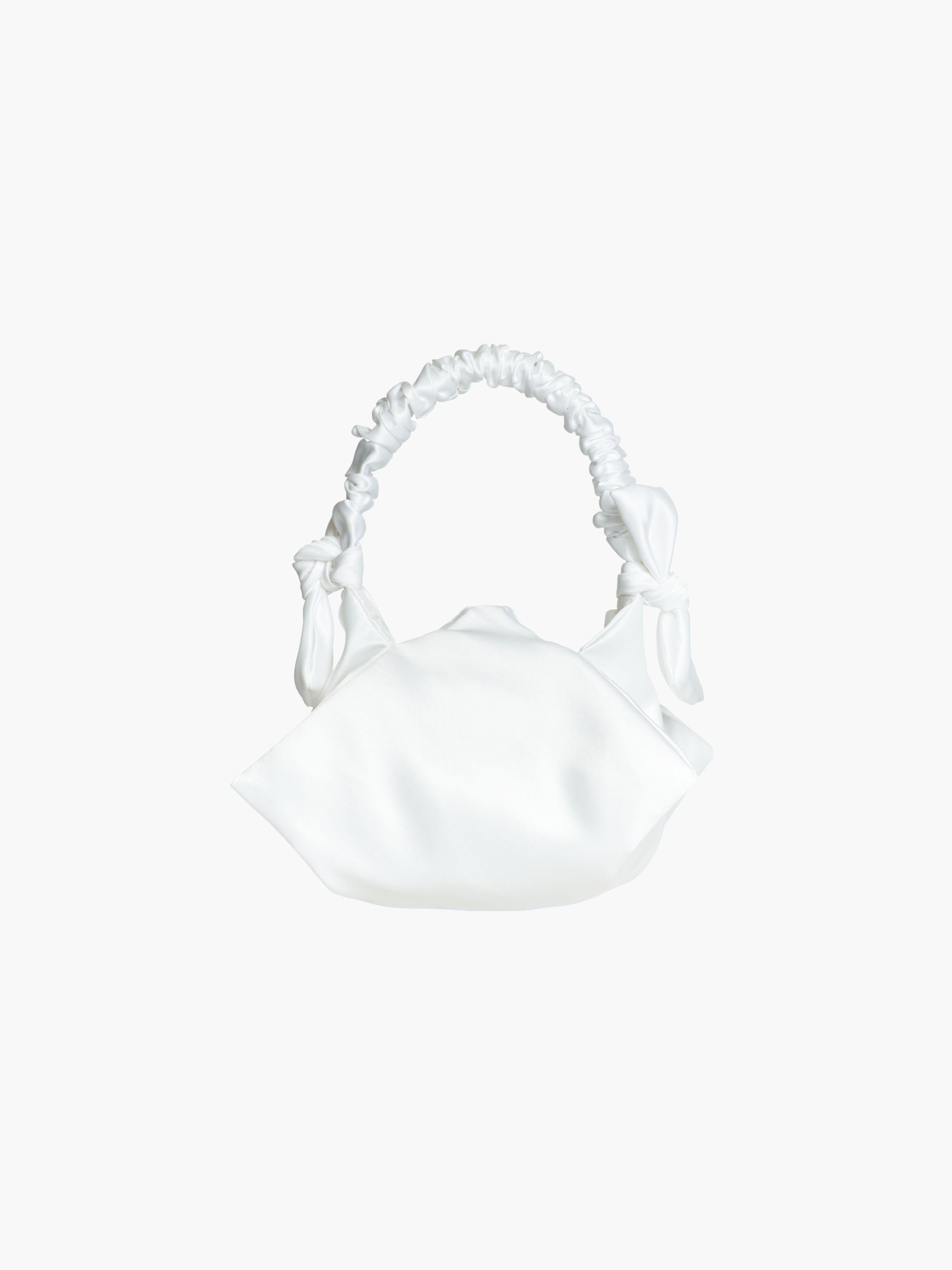 Inspired by origami and vintage evening bags, this elegant structured silhouette is finished off with our signature scrunchie handle and decorative knots.