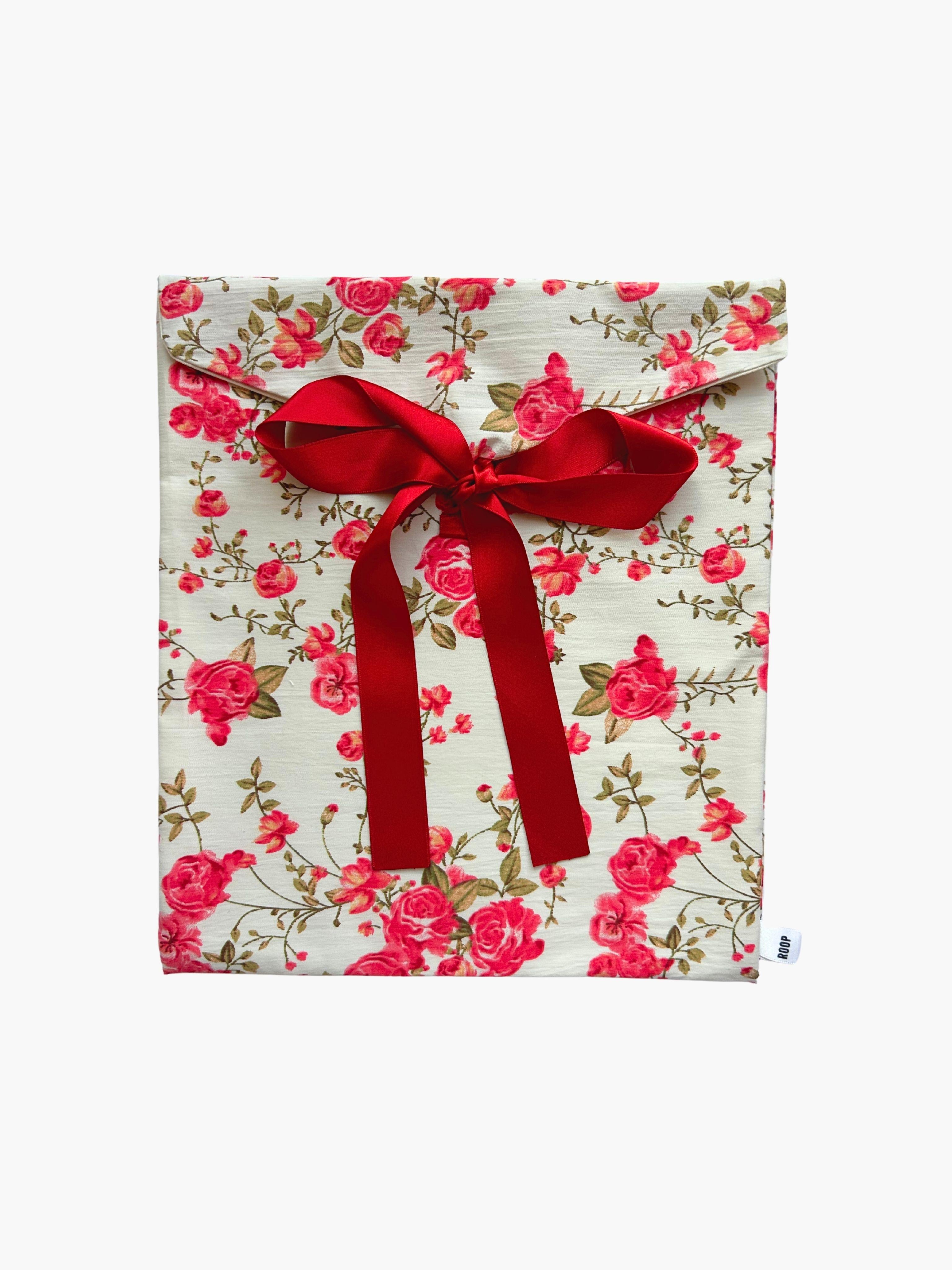 Fabric: Deadstock cream and red rose print fabric, cream lining. Finished with ivory ribbon made from recycled plastic bottles.